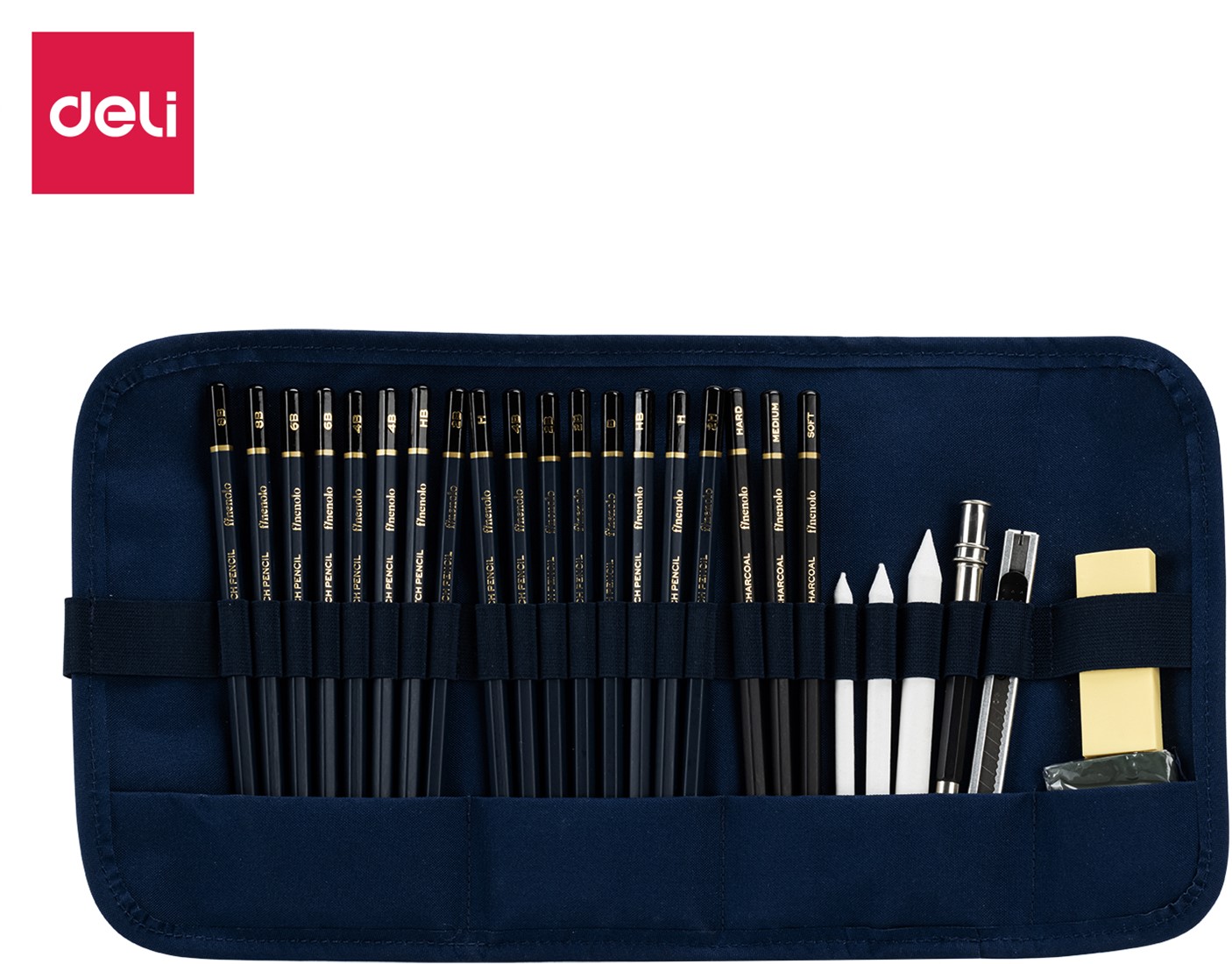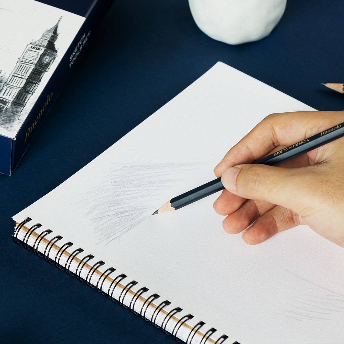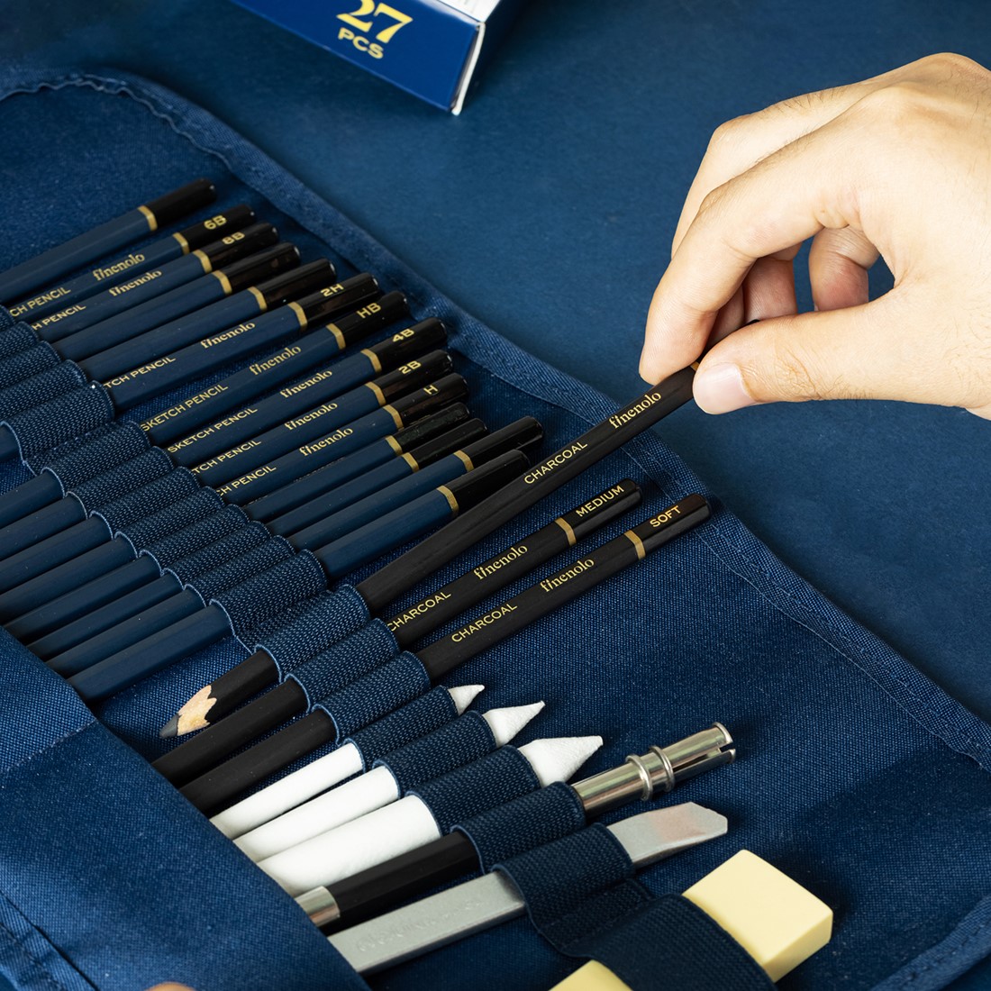FINENOLO schetspotloden set – 27 stuks biedt een uitgebreide selectie voor veelzijdig teken- en schetswerk. Ideaal voor wie wil werken met verschillende hardheden en technieken, van fijne lijnen tot diepe schaduwen.